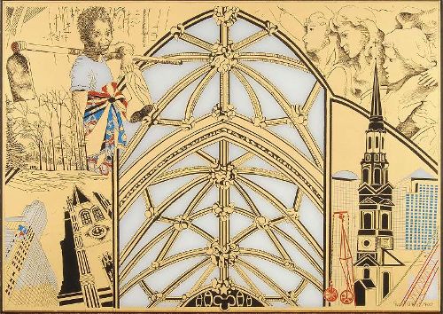 The concept is for the image to be fabricated in gold leaf on glass with details in reverse painting and eglomise (19x26”). When completed, the image would be photographed and a full-scale version would be framed for preservation in the archives. The glass would then be cut into 80, 2.5x2.5” pieces. Each square fragment will be framed for preservation and presented to the Strategic Planning 2007 participants (Vestry, Congregational representatives, neighbors, professional consultants, etc.) with an Iris print of the whole image from the original composition. On the back of the framed print and numbered piece of gold-leafed glass will be an envelope with a drawn key of the whole composition locating each piece by its number. The recipient will know where their piece fits into the whole, but the original glass piece could only be reconstructed through convening the original network of contributors. The whole will exist metaphorically through the relationships maintained between the people whose vision created the Strategic 2007 One Parish Plan.